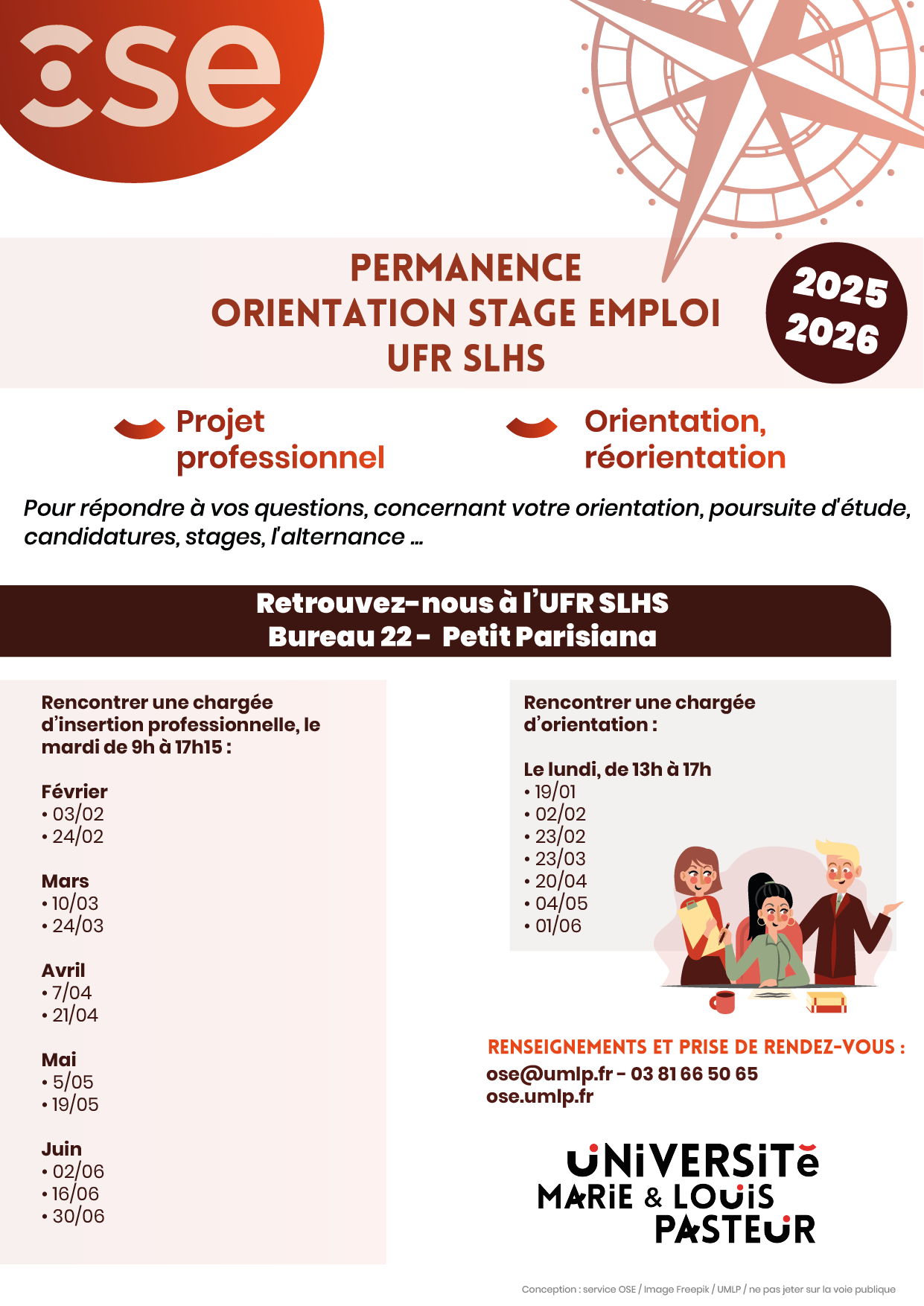 Etudiants et étudiants internationaux nous sommes présents pour vous accompagner lors de votre arrivée à l'université de Franche-Comté. Des permanences par nos étudiants sont mises en place pour vous aider dans vos démarches :